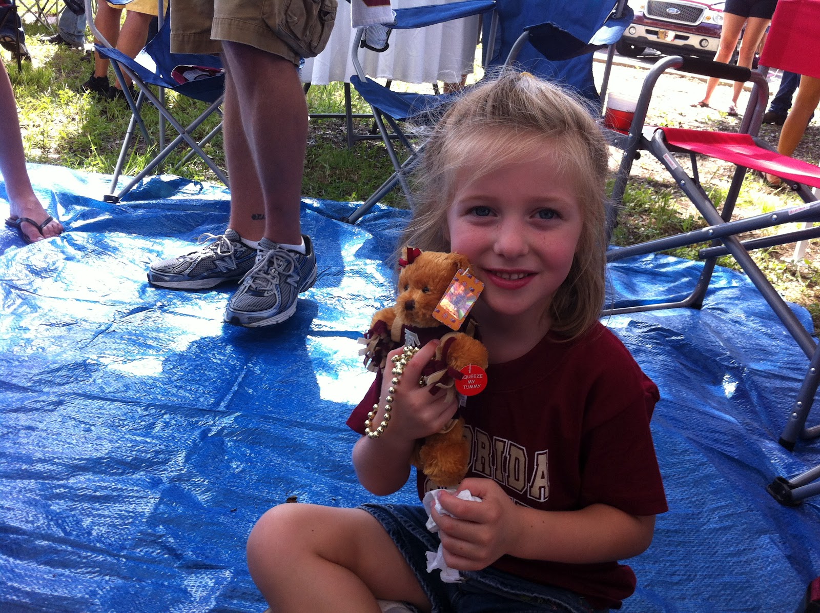 Audrey at the pregame tailgate. One of D's fraternity brothers told Audrey that she could have this little Teddy Bear if she went up to another guy and told him that he looked like a chicken hawk....clearly fraternity boys never really grow up.